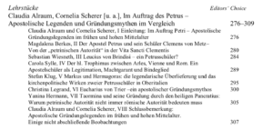 Im Wintersemester 2017/2018 setzten sich fortgeschrittene Studierende der Geschichte in der Forschungsübung „Im Auftrag des Petrus – apostolische Legenden und Gründungsmythen im Vergleich“ , die von Frau Dr. Claudia Alraum und Frau Dr. Cornelia Scherer geleitet wurde, mit der Frage nach Inhalt, Entstehung und Rezeption von Apostelschülerlegenden im frühen und hohen Mittelalter auseinander. Die von der Forschung bisher weitgehend unbeachtete Thematik wurde in intensivem Quellenstudium in vergleichender Perspektive bearbeitet. Die essayistischen Ergebnisse der einzelnen Teilnehmer*innen sind nun als Beitragsreihe in der Online-Fachzeitschrift „Mittelalter. Interdisziplinäre Forschung und Rezeptionsgeschichte“ erschienen und begründen auf dem gleichnamigen Wissenschaftsblog zugleich die neue Reihe Lehrstücke.