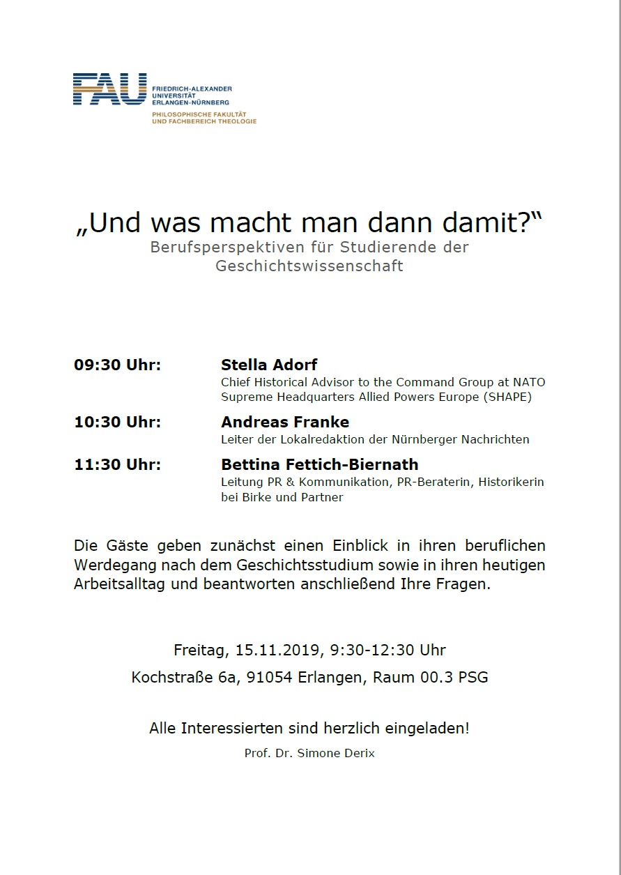 Der Lehrstuhl für Neueste Geschichte und Zeitgeschichte veranstaltet am 15. November 2019 eine Informationsveranstaltung zu Berufsperspektiven für Historiker*innen. Die Idee ist, den Studierenden einen Einblick zu geben, welche beruflichen Perspektiven ein Geschichtsstudium neben der Lehrtätigkeit an Schulen noch bietet. Eingeladen sind drei Expert*innen aus der Praxis, die einen Vormittag lang Einblicke in ihre unterschiedlichen Berufsbilder von der Arbeit in einer internationalen Organisation über Journalismus bis zur Geschichts- und Kommunikationsagentur geben. Die Gäste erläutern außerdem, welche Schritte sie nach ihrem Geschichtsstudium an der FAU zu ihren heutigen Tätigkeitsfeldern geführt haben und stehen für Fragen der Studierenden zur Verfügung. Bei weitergehendem Interesse soll die Veranstaltung der Auftakt zu einer Reihe sein, in der möglichst viele Berufsfelder vorgestellt werden.