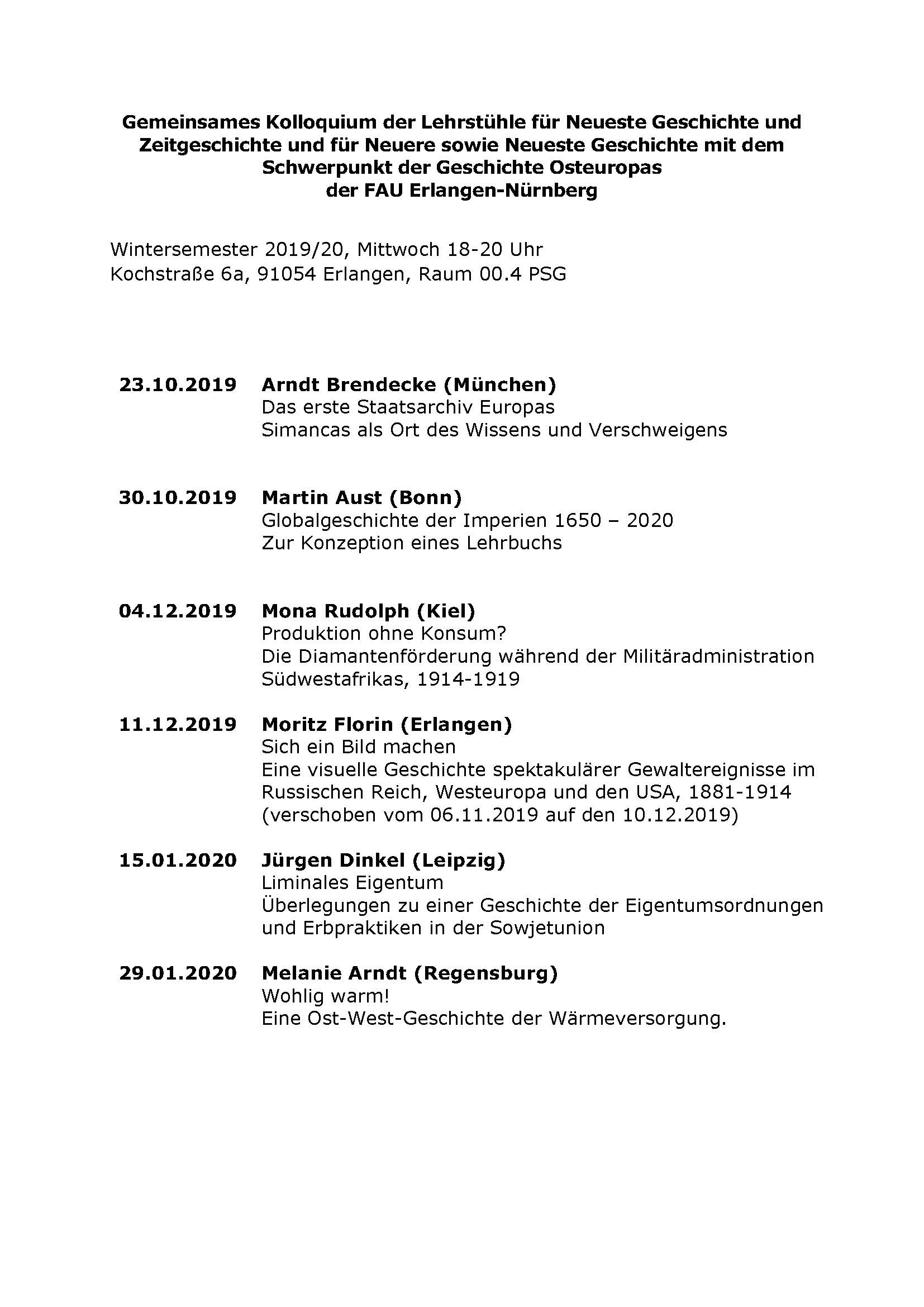 Im Wintersemester 2019/20 veranstalten die Lehrstühle für Neueste Geschichte und Zeitgeschichte und für Neuere sowie Neueste Geschichte mit dem Schwerpunkt der Geschichte Osteuropas ein gemeinsames Kolloquium. Die sechs Vorträge finden mittwochs von 18-20 Uhr in Raum 004. PSG, Kochstraße 6a statt. Alle Interessierteren sind herzlich eingeladen!