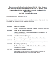 Im Sommersemester 2020 veranstalten die Lehrstühle für Frühe Neuzeit, Neueste Geschichte und Zeitgeschichte und für Neuere sowie Neueste Geschichte mit dem Schwerpunkt der Geschichte Osteuropas ein gemeinsames Kolloquium. Die sechs Vorträge finden online als Zoom-Meeting statt. Die Anmeldung erfolgt über die Stud-On-Kurse zu den Oberseminaren der beteiligten Lehrstühle.
