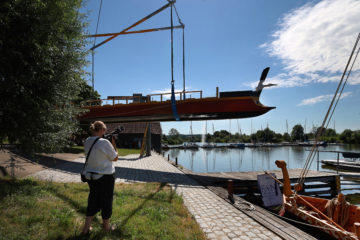 Am 26. Juni 2022 war es endlich soweit. Die Danuvina Alacris konnte ihre Bootsbauhalle in Schlungenhof verlassen. Per Schwerlasttransport wurde sie aus der Halle zum nur wenige Meter entfernten Ufer des Altmühlsees gebracht, wo bereits ein Kran auf sie wartete. Der Kran hievte das Boot sodann mithilfe einer speziellen Traverse auf den Altmühlsee. Dort, wenige Meter über dem Wasserspiegel schwebte das Boot. Teil 2 begann. Prof. Dreyer hieß ein ungefähr 200 Mann starkes Publikum willkommen, informierte kurz über das Gesamtprojekt und den Bootsbauprozess. Es folgten Grußworte von Prof. Hirsch, einem der Vizepräsidenten der FAU Erlangen-Nürnberg, Herrn Fitz, dem Bürgermeister Gunzenhausens und Frau Naaß, der Vizepräsidentin des Bezirkstags Mittelfranken, die das Boot taufte. Anschließend wurde das Boot auf dem Wasser abgelegt. Bei diesem Prozess, der sog. Wasserung, kommt das Holz des Bootes erstmal mit Wasser in Berührung. Dieser Wasserkontakt ist integraler Bestandteil des Bootsbauprozesses. Das Boot kann dabei leicht versinken, da es zu diesem Zeitpunkt noch nicht dicht ist und mit Wasser vollläuft. Das Holz quillt auf und dehnt sich aus – erst jetzt wird das Boot wirklich dicht.