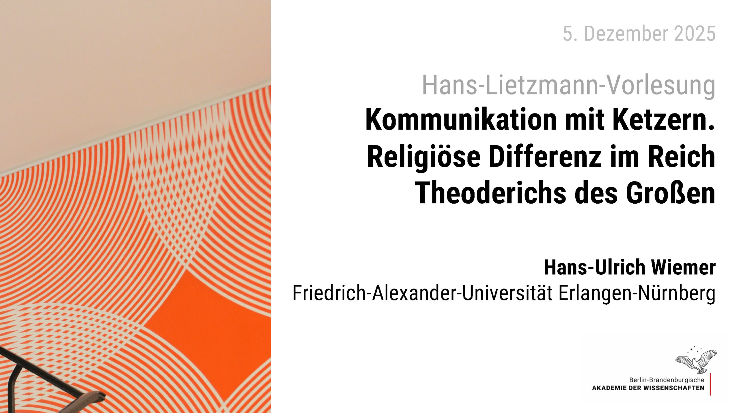 Prof. Dr. Hans-Ulrich Wiemer (Lehrstuhl für Alte Geschichte) ist die Ehre zuteil geworden, in Jena und Berlin die 30. Hans-Lietzmann-Vorlesung zu halten. Der Vortrag vom 4./5. Dezember 2025 stand unter dem Titel „Kommunikation mit Ketzern. Religiöse Differenz im Reich Theoderichs des Großen“ und wird in erweiterter Form beim Verlag de Gruyter Brill erscheinen.