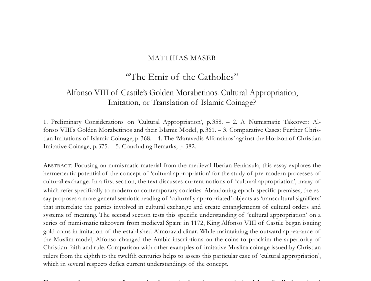 Ist das Konzept „kulturelle Aneignung“ hilfreich für das Verständnis kultureller Austauschprozesse im Mittelalter? In seinem Aufsatz „The Emir of the Catholics: Alfonso VIII of Castile’s Golden Morabetinos. Cultural Appropriation, Imitation, or Translation of Islamic Coinage?“ geht Matthias Maser dieser Frage am Beispiel numismatischer Quellen von der mittelalterlichen Iberischen Halbinsel nach.