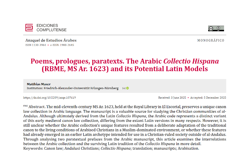 Matthias Maser, Poems, Prologues, Paratexts. The Arabic Collectio Hispana (RBME, MS Ar. 1623) and its Potential Latin Models, in: Anaquel de estudios árabes 37/1 (2026), S. 17-29.