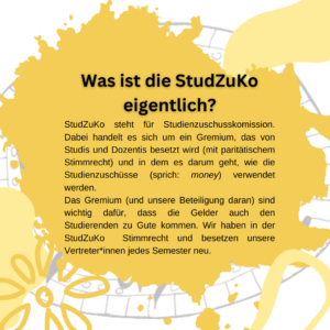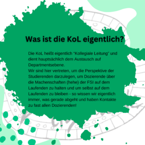 Zudem sitzen unsere Vertreter*innen in zwei der wichtigsten Gremien, der Kollegialen Leitung und der Studienzuschusskommission – dazu unten mehr. Wenn ein Lehrstuhl neu besetzt wird, gibt es einen Berufungsausschuss, in dem ebenfalls meistens zwei FSI-Mitglieder sitzen. Und natürlich pflegen wir Kontakte zu Dozierenden, Förderverein und Ehemaligen und helfen gerne, wo wir helfen können!